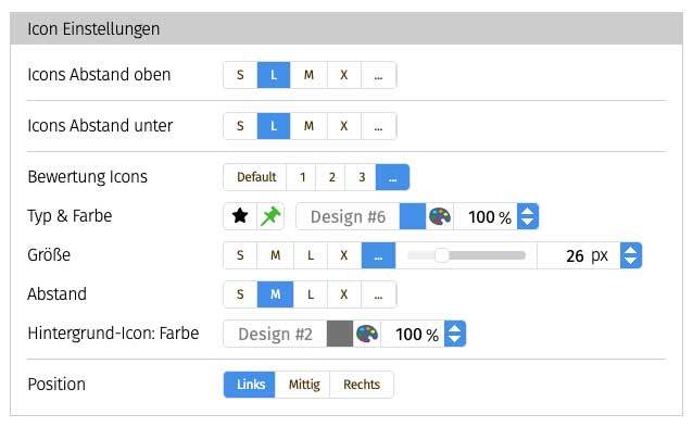 Das Icon-System ist perfekt, wenn du Bewertungen oder andere Symbole in deine Karten integrieren möchtest. Du kannst die Position der Icons bestimmen – links, mittig oder rechts – und ihre Abstände nach oben und unten anpassen.