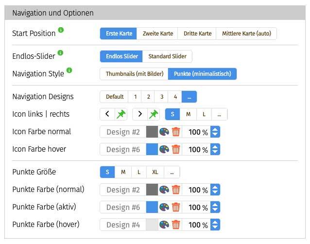 Bei der Navigation zwischen den Karten hast du verschiedene Optionen: Du kannst kleine Vorschaubilder (Thumbnails) verwenden oder minimalistische Punkte wählen. Die Farben und Größen lassen sich dabei ganz nach deinem Design anpassen.