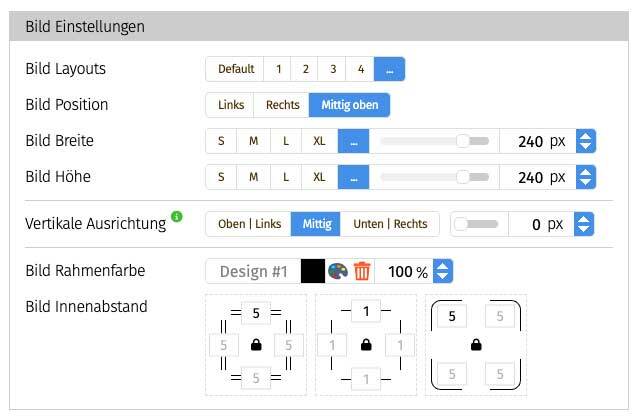 Die Bildgröße lässt sich präzise einstellen – von kleinen quadratischen Icons bis zu großen Hero-Bildern ist alles möglich. Die vertikale Ausrichtung bestimmt dabei, ob das Bild oben, mittig oder unten im verfügbaren Bereich positioniert wird.