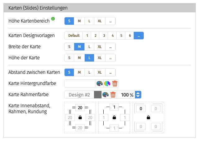Rechts siehst du die Live-Vorschau deiner Änderungen. Was du links einstellst, wird sofort rechts sichtbar – so behältst du immer den Überblick und siehst sofort, wie sich deine Änderungen auswirken. Diese Live-Vorschau erleichtert ungemein die Arbeit. Mit den Vorlagen wird es noch einfacher. Im Bild unter diesem Text ist der Bereich "Karten (Slides) Einstellungen. Dort siehst du zum Beispiel das Label "Karten Designvorlagen" und daneben mehrere Buttons. Klickst du auf "Default" oder eine Zahl, werden von uns voreingestellte Werte übernommen und du siehst live, wie die Karte damit aussehen würde. Klickst du auf den Button mit den 3 Punkten, wie im Dialog angezeigt, klappen alle Optionen aus und du kannst dann einzelne oder alle Werte beliebig anpassen, natürlich auch immer mit direkter Live-Vorschau.