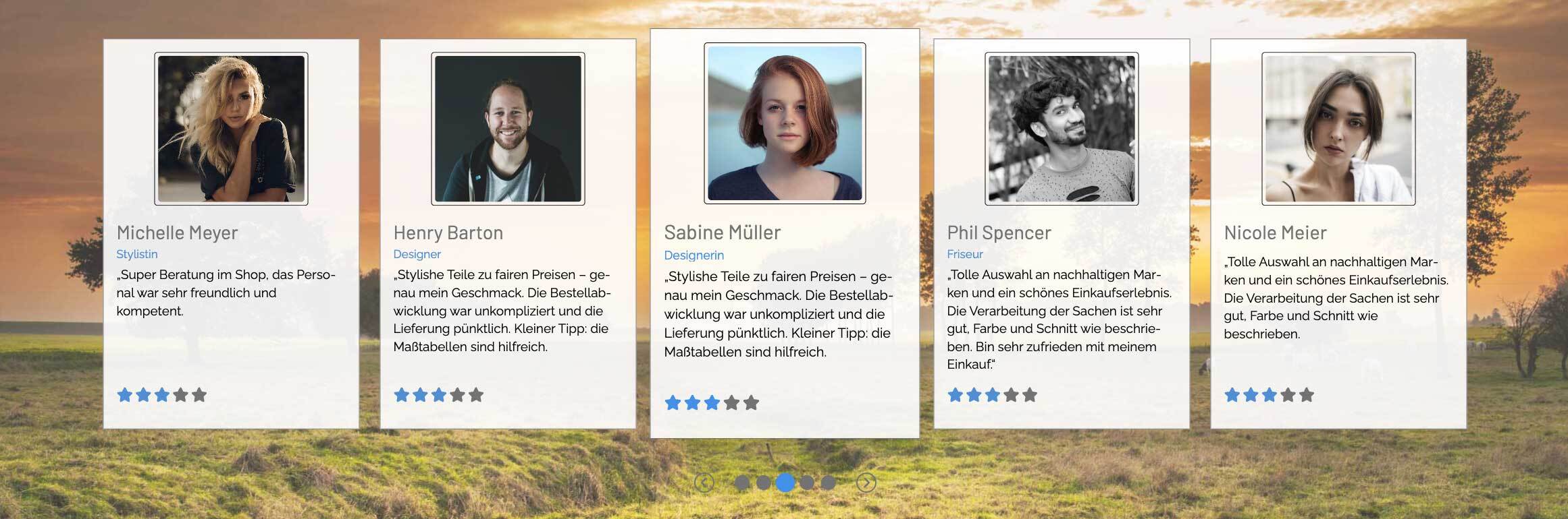 So könnte dein fertiger Card-Slider aussehen – perfekt für die Vorstellung deines Teams auf deiner Homepage. Jede Karte zeigt ein Foto, den Namen, die Position und eine kurze Beschreibung der Person. Die Bewertungssterne am unteren Rand geben zusätzliche Glaubwürdigkeit. Der Text ist nur ein Beispieltext, in diesem Fall Texte für die Bewertung eines Shops. Die aktive Karte wird leicht vergrößert dargestellt.