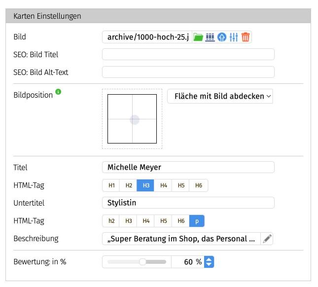 Die Bildeinstellungen sind besonders flexibel gestaltet. Du kannst wählen, wo das Bild platziert werden soll: links neben dem Text, rechts daneben oder mittig oben. Je nach Inhalt und gewünschter Wirkung wählst du das passende Layout. Die Karten haben eine Abfrage der Breite integriert. Ist die tatsächliche Breite kleiner als 401 Pixel wird automatisch das Bild oben mittig angezeigt und der Text darunter angeordnet. Unabhängig davon, was du eingestellt hast. Das sorgt dafür, dass die Karte immer perfekt aussieht.